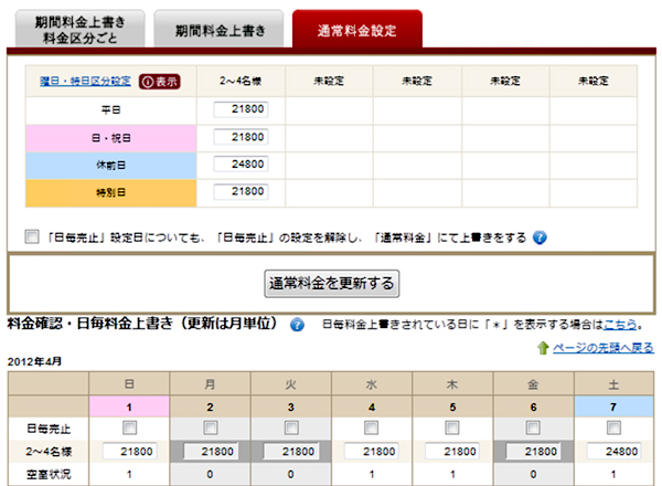 料金設定は管理画面上から、【日別・プラン別】で自由に設定することが可能です。